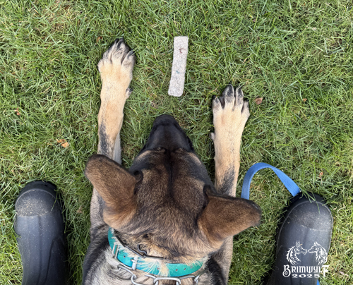 Move articles around, take them outside on grass and dirt, place them in a different room of the house and ask the pup to "find it" so that he learns that articles with your scent on them are a good trade for food. If you would like to put a command with the behavior, you can pair the correct behavior with the command, by saying "article" before the click. Then you are ready to use it on your track. If you use 2 lines to track, it is easier to stop him turning towards you when you give the article command. Make sure you are right up beside him as he gets to the article so you can reward as soon as he downs.